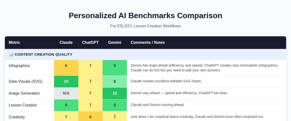 I compared Claude, ChatGPT, and Gemini across 22 metrics while creating multi-exercise lesson packages on various contemporary topics. Each package includes 10-12 exercises: brainstorming, visual vocabulary, listening quizzes, gap-fills, collocations, grammar, critical thinking, and role plays.