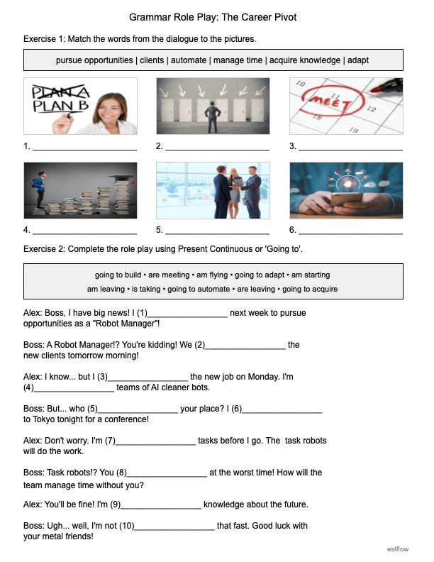 Future of Work is a comprehensive pre-intermediate lesson exploring how technology is changing careers. Students build essential vocabulary through visual matching, gap-fill dialogues, and collocation practice, then apply their knowledge in listening quizzes, role plays, and critical thinking tasks. The package includes a complete answer key and audio files for the listening components.