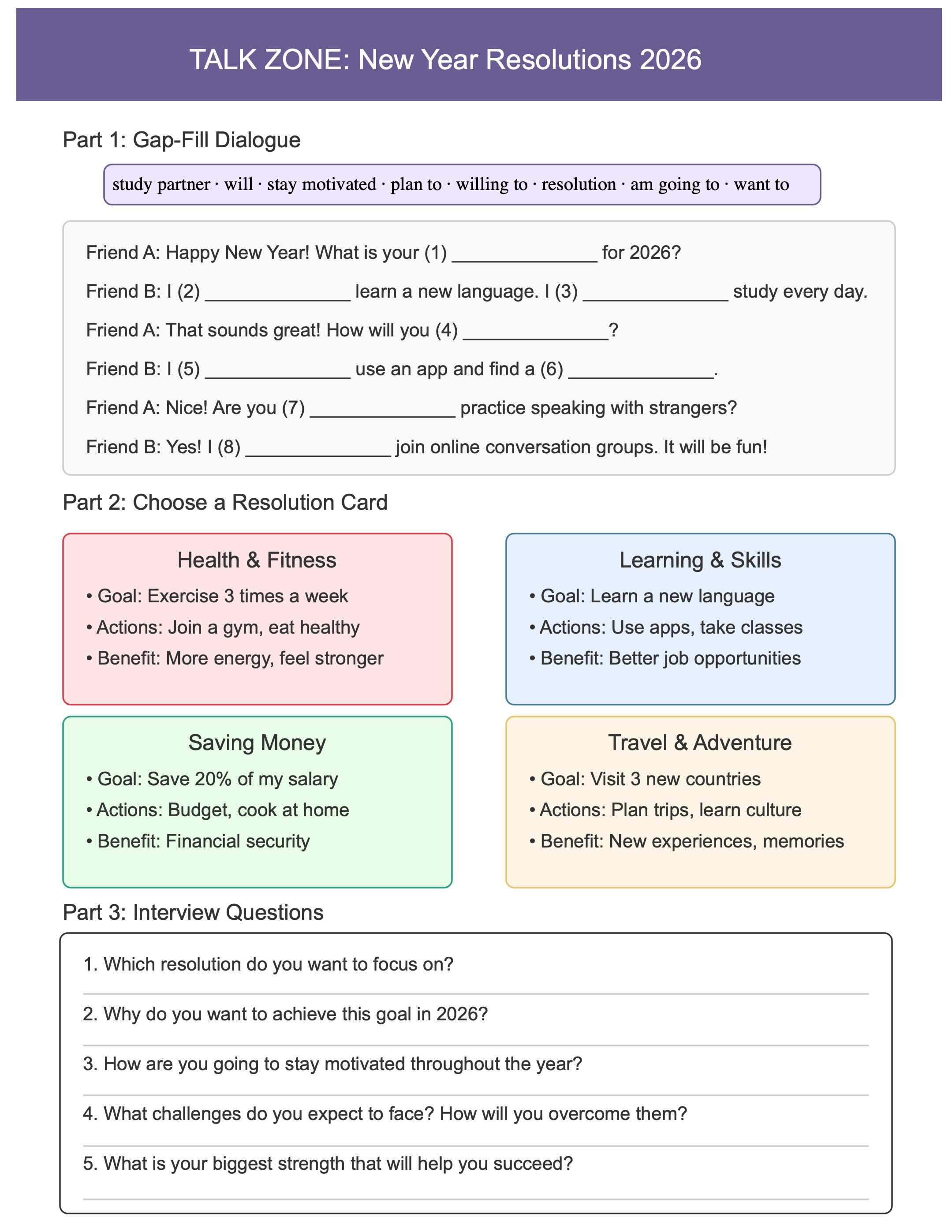 Talk Zone is a speaking activity designed to engage and build conversation confidence. Students begin with a gap-fill dialogue to practice key vocabulary, then choose a topic card that interests them. Finally, they use the interview questions to have a real conversation with a partner. Each Talk Zone focuses on a practical, real-world theme to make discussion meaningful and relevant.